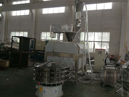 原料可通過手工或真空上料器加入料鬥,經垂直放置的送料螺杆輸送和壓縮,被推至兩擠壓輥輪的咬入角;通過水平放置的壓輥,將原料擠壓成薄片(壓輥的速度決定物料在輥壓區停留的時間);物料所需的壓力通過液壓裝置線性傳送給壓輥,垂直排列的壓輥可保證物料密度的*性。根據不同块状度要求,設備製粒係統中的篩網目數大小可相互更換。